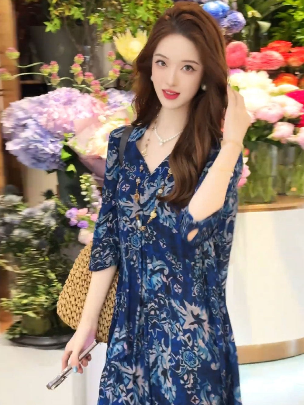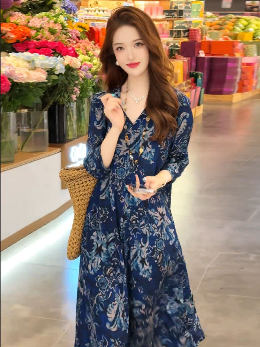 【復古顯瘦洋装】大地色植物印花融入自然,耐磨麵料防刮蹭,深色系顯高顯瘦,高級感滿滿~