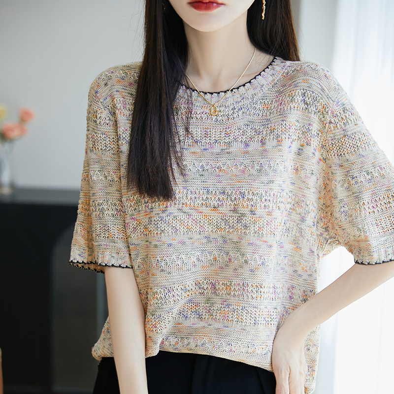 精緻混紡鏤空針織上衣 圓領滾邊溫柔顯氣質 透氣不悶熱 寬鬆版型不挑身形 通勤休閒都百搭